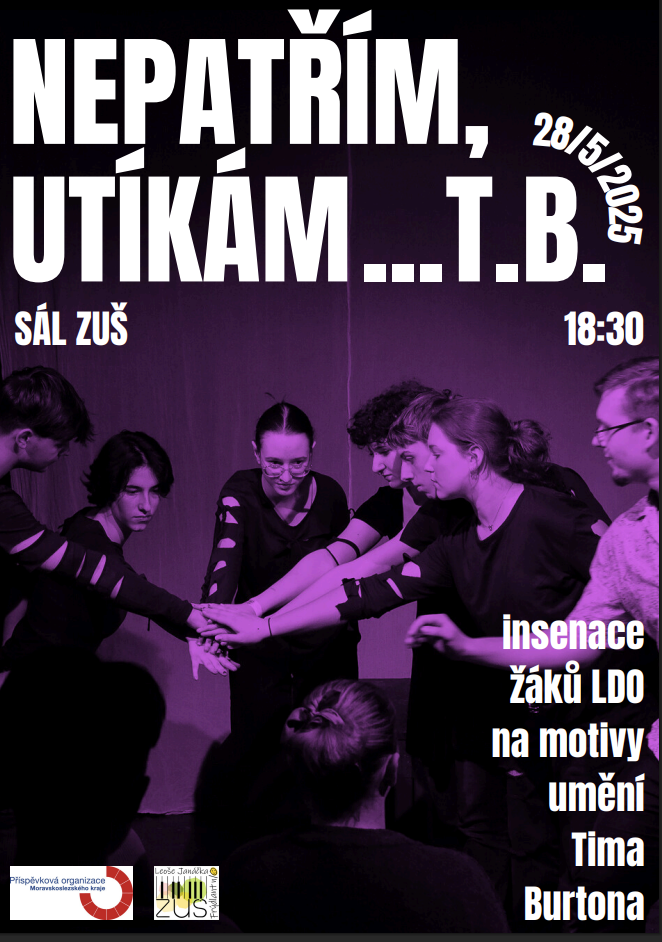 Cítili jste se někdy osamělí a odmítnutí lidmi okolo vás? Toto téma se rohodli zpracovat žáci LDO pod vedením paní učitelky Jitky Kvasničkové ve své nové inscenaci „Nepatřím, utíkám…T. B. “ Premiéra proběhla na jevišti profesionálního divadla Studia G v Ostravě dne 5. 4. 2025 v rámci krajského kola studentských a experimentálních divadel Experis. Derniéru můžete vidět už 28. 5. v 18:30 hodin v sále naší ZUŠky. Hudbu k inscenaci složil Martin Dytko, vyučující na naší škole kytaru. Jste srdečně zváni